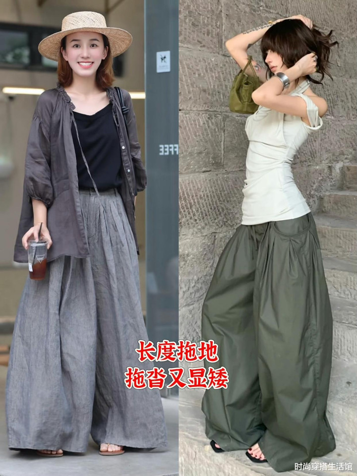 其次就是因为阔腿裤的版型非常宽松,对于小个子女生来说选择过长的裤腿反而会造成拖沓显累赘,尤其是拖地长度的阔腿裤,视觉上看起来确实很显高,但世界上容易“行走的拖把”既视感。我们看上面的图片就知道了,小个子穿拖地长度的阔腿裤,完全不露脚的“横向截断”,看着裤腿直愣愣的,虽然整体显腿长,但却非常突兀拖沓。