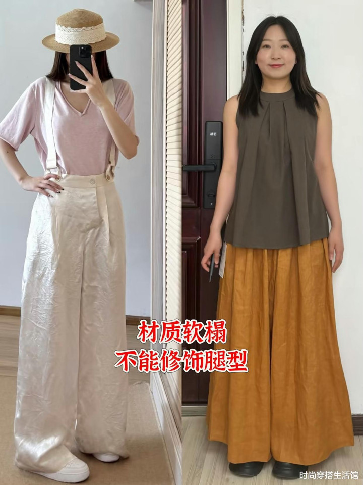 最后就是秋天早晚温差比较大,所以我们在选择阔腿裤材质的时候还是会选择凉爽的材质,像是雪纺、亚麻、莫代尔等材质,但我们在选择阔腿裤的时候并不建议大家去选择软塌变形的材质,这些廉价的面料只会紧紧贴合我们的腿型,会将腿部缺点和假胯宽的赘肉暴露出来,视觉上显胖10斤不止。